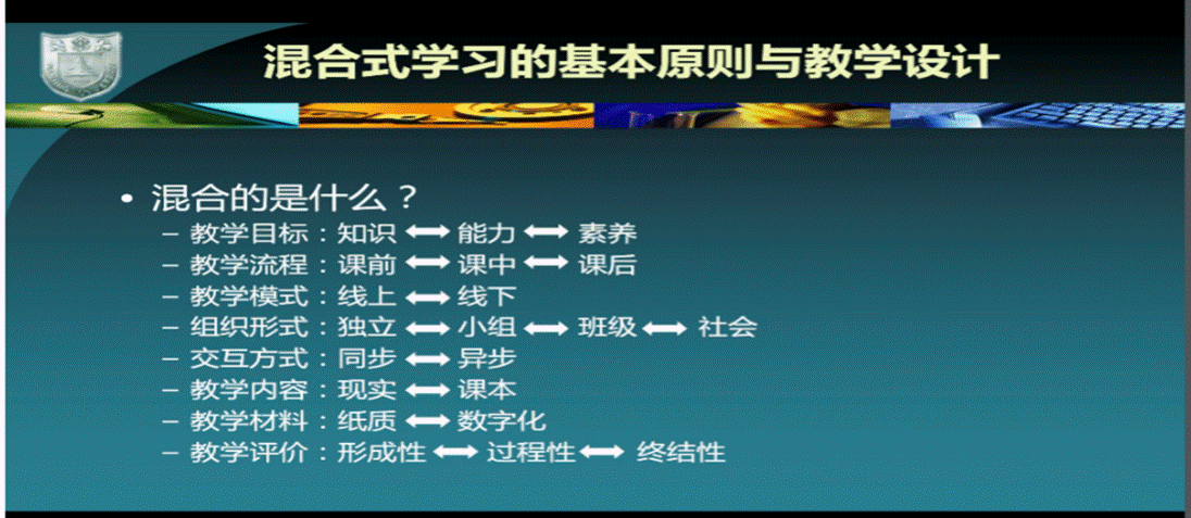 混合式学习的工作原理和教学设计,王教授认为应该整合基于口头和文本的沟通,融合以计算机为媒介的沟通方式,独立或协作学习体验,探究学习共同体。