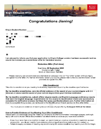随着专业学习的不断深入,我也逐渐开始思考未来的发展方向,并在探索中尝试不同领域的可能。目前,我已收到悉尼大学网络安全硕士和伦敦国王学院(KCL)机器人硕士的录取,同时仍在继续申请和评估其他项目。
